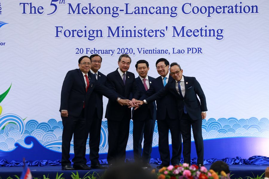 Chinese State Councilor and Foreign Minister Wang Yi (L3) and other five Mekong country foreign ministers take a group photo at the beginning of the fifth Lancang-Mekong Cooperation (LMC) Foreign Ministers’ Meeting in Lao capital Vientiane on Feb. 20, 2020. (Xinhua/Kaikeo Saiyasane)